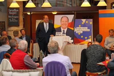 Schließlich kam der Staatsminister vor der Diskussion mit den Anwesenden noch auf die Außenpolitik zu sprechen. Auch hier vertrete die CDU im Einklang mit den Partnern der Europäischen Union und der NATO verlässliche Positionen. Das auch von den SPD-Ministern Steinmeier und Gabriel mit vereinbarte 2%-Ziel der Nato könne man nicht so einfach aufkündigen, um damit auf Stimmenfang zu gehen, kritisierte Braun eine Wahlkampfforderung der SPD. Die damit einhergehende verbesserte Ausrüstung der Bundeswehr, personell und materiell, sei mit den Bündnispartnern verbindlich abgestimmt und auch von diesen so gewollt.