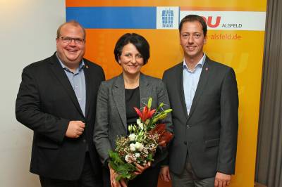 Die stellvertretende CDU-Vorsitzende Claudia Kreis-Helm wurde von Alexander Heinz und Stephan Paule aus dem Vorstand verabschiedet.Der CDU-Stadtverbandsvorsitzende Alexander Heinz nahm gemeinsam mit Bürgermeister Stephan Paule (CDU) die Ehrungen vor. Er bedankte sich in einer kurzen Ansprache bei allen Geehrten für ihr Engagement für die politischen Ziele der Partei und insbesondere für den Einsatz im Stadtverband und damit für das Wohl der Stadt Alsfeld. Für 40 Jahre Mitgliedschaft wurden geehrt: Horst Simon (Alsfeld), Hans Frank und Anita Hesse (beide Leusel). Die Urkunde für 25 Jahre Mitgliedschaft erhielt der ehemalige Ortsvorsteher von Lingelbach, Uwe Stein. Nachdem die von Angela Merkel, Volker Bouffier und Jens Mischak unterzeichneten Urkunden verlesen waren, steckte Stephan Paule die Ehrennadel an und Alexander Heinz überreichte Urkunden, CDU-Tasse und den CDU-Kugelschreiber.