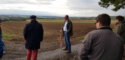 Auf Einladung des CDU-Vorsitzenden Alexander Heinz stellten Bürgermeister Stephan Paule (CDU) und Bauamtsleiter Tobias Diehl den bisherigen Planungstand und den weiteren zeitlichen Ablauf dar. Mit Blick ins Gelände erläuterte Diehl die Erschließung des Geländes mit Ver- und Entsorgungsleitungen sowie die geplante Anbindung an die Bundesstraße.