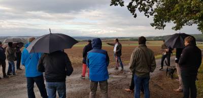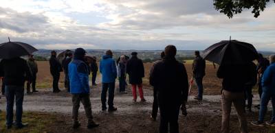 Inhaltliche Erläuterung: Tobias Diehl vom Fachbereich „Bauen und Liegenschaften“ der Stadt Alsfeld erläutert die Entstehung des Gewerbegebiets „Am Weißen Weg“. Foto: A. Merle.Treffpunkt war am Vereinsgelände des Modelsportvereins Alsfeld unterhalb des Hombergs, das etwas außerhalb des künftigen Industriegebietes „Am Weißen Weg“ liegt. Von dort ging es einige Meter zu Fuß zum höchsten Punkt des künftigen Industriegebiets, von wo aus man einen guten Überblick über das gesamte Areal hat, das in großen, zusammenhängenden Grundstücken von über 100 000 Quadratmetern vermarktet werden soll.